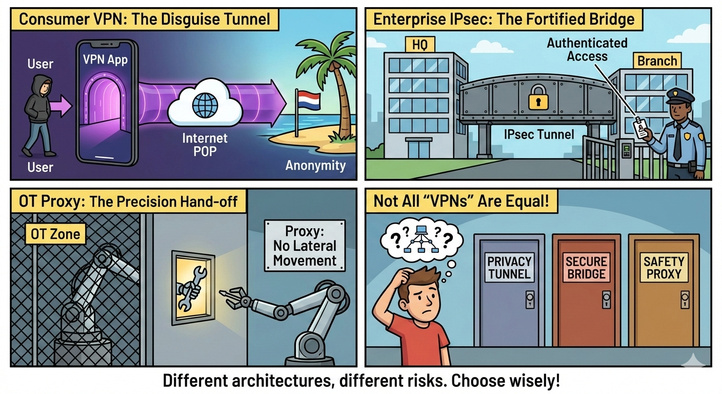This article dissects the underlying mechanisms—IPsec, GRE, WireGuard, and Protocol Breaking—to clarify why Consumer VPNs, Enterprise VPNs, Identity Overlays, and OT access platforms are fundamentally different tools designed for different risk models.