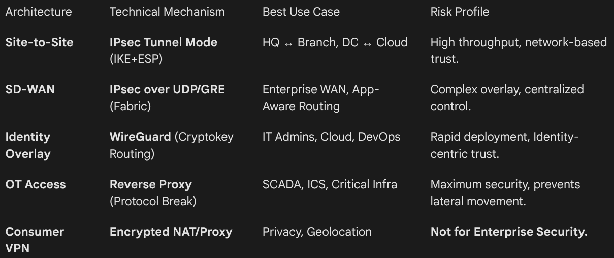 Strong architectures emerge when connectivity models are selected based on the underlying packet mechanics and business risk, not just the "VPN" label.