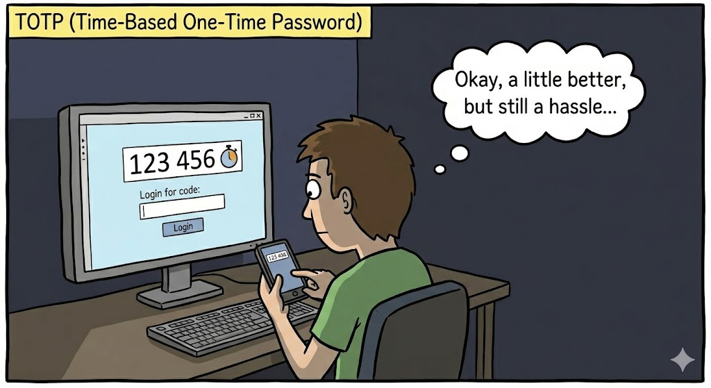 But TOTP still relies on a shared secret that can be phished: attackers can set up look-alike sites that collect your password and code and immediately use them in real time (“real-time phishing”) .