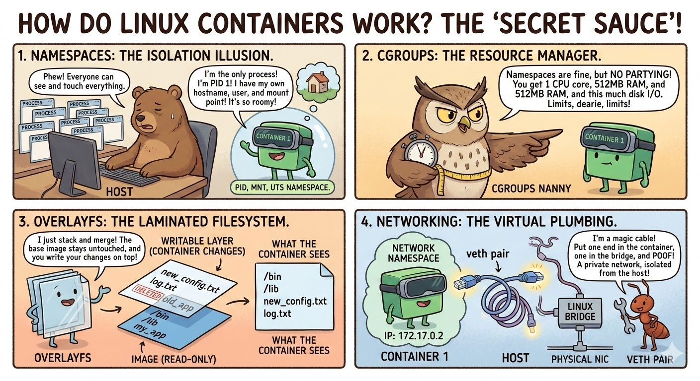 Containers are just namespaced, cgroup-limited processes with a layered filesystem. No magic, no hidden VMs. Once you internalize that, everything on top of it, whether that's Docker, Podman, Kubernetes, or a managed cloud service like EKS or Cloud Run, starts to make a lot more sense.