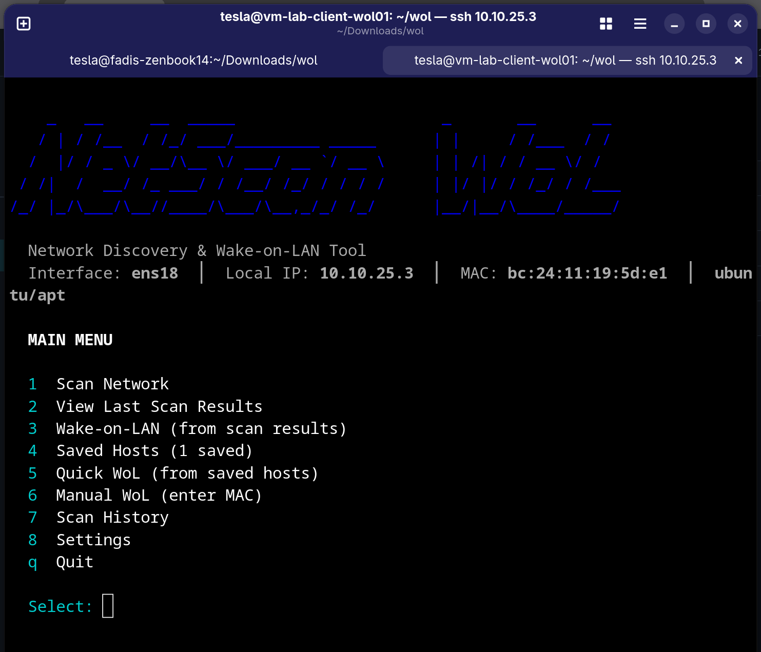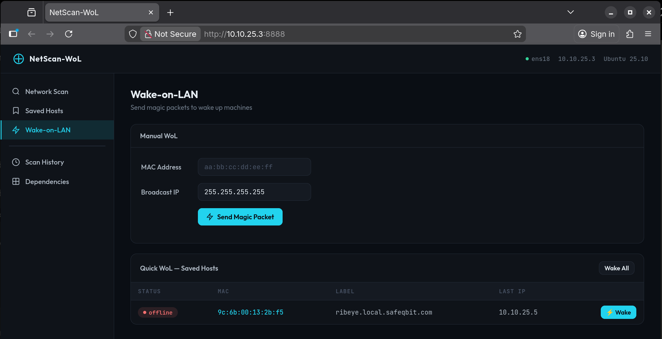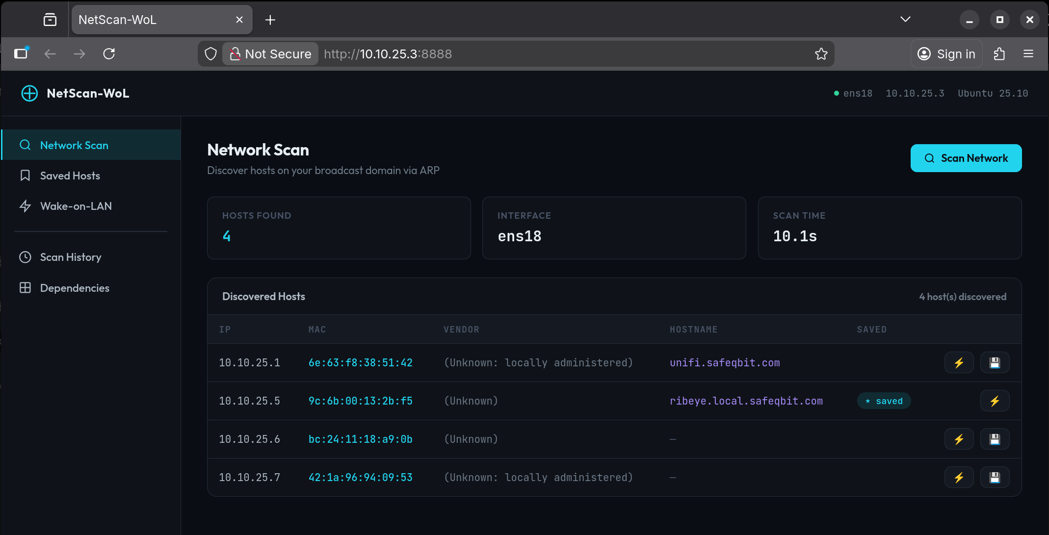 NetScan-WoL is a bash tool that scans your broadcast domain via ARP, discovers every host with its IP, MAC, and vendor, resolves hostnames, and lets you send Wake-on-LAN packets, all from one interactive menu. It also ships with an optional web UI you can deploy as a systemd service for browser-based access.