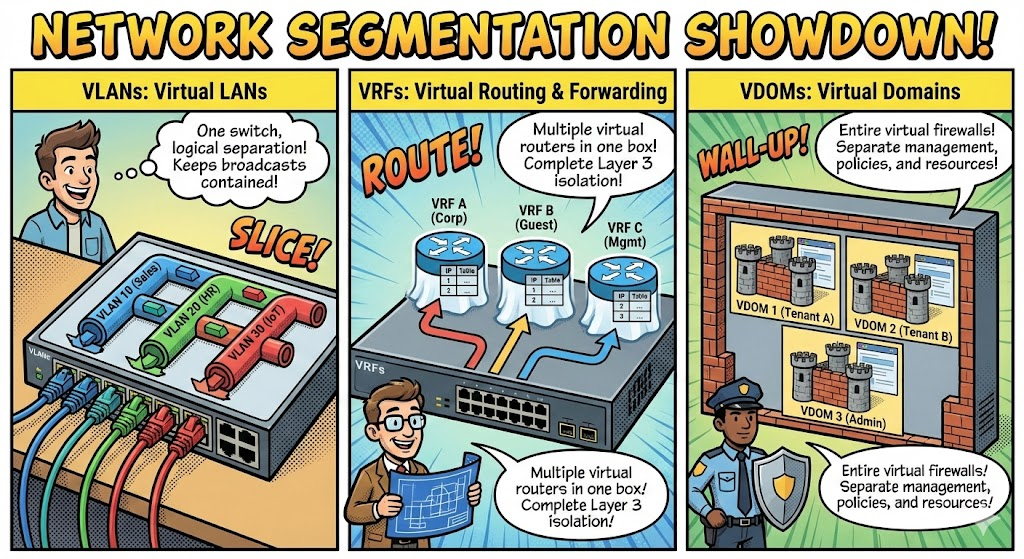 Today, I want to unpack three key segmentation techniques: VLANs, VRFs, and Virtual Domains (VDOMs) from the perspective of different vendors and device types. Plus, I’ll share which approach I think is superior for specific use cases.