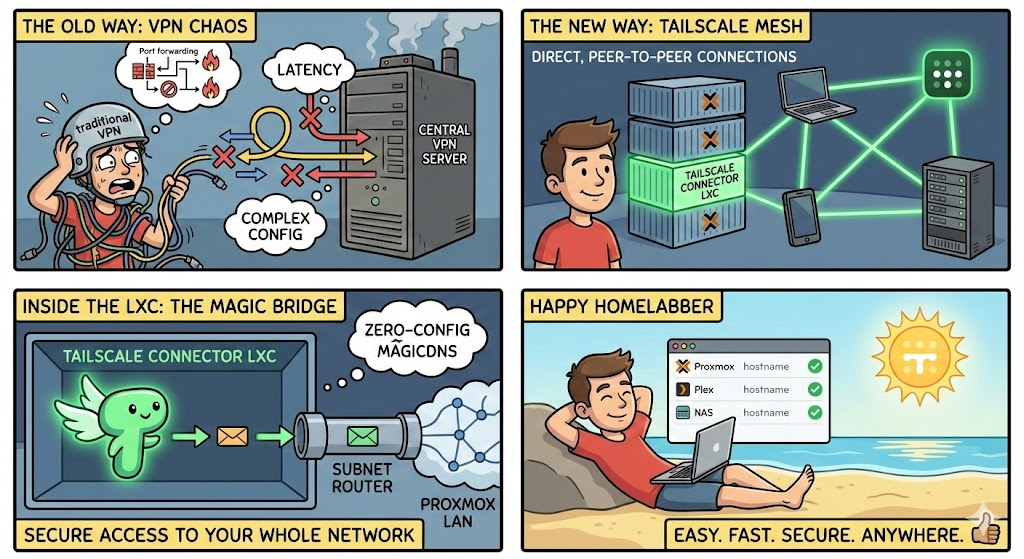 If you're running a homelab and want secure remote access without poking holes in your firewall, Tailscale connectors are the answer. Here's how to set them up and why they're superior to traditional VPN solutions.
