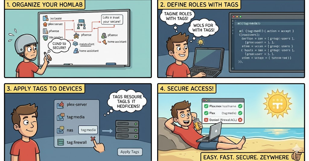 Tailscale's default behavior allows all devices on your Tailnet to communicate freely. For homelabs with multiple users or sensitive workloads, you'll want to tighten this with ACLs (Access Control Lists).